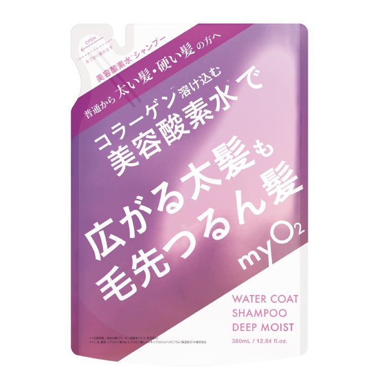myO2は、シャンプー・トリートメントの構成の50%以上を占める「水」に着目し、特殊製法の「酸素⽔*4」とコラーゲン*2、ヒアルロン酸*5を組み合わせた美容酸素水*1を基材に使⽤。⽔に溶け込んだ酸素(保湿成分)が水と一緒に毛髪へ浸透し、高い浸透力による水分に満ちた美髪を提供します。