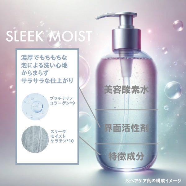スリークモイストは、細髪の方が持つ「パサつき」「うねり」「からまり」という悩みに対して、プラチナナノコラーゲン*9、スリークモイストケラチン*10を組み合わせた処方で、濃厚でもちもちな泡による洗い心地、からまらず、うるおい、サラサラな仕上がりをシャンプー・トリートメント・ヘアミルク・ヘアオイルで提供します。