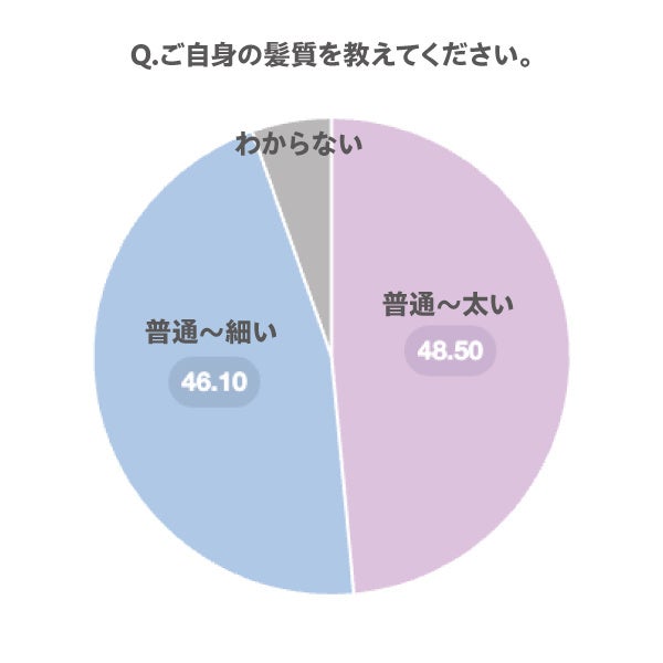 自身の髪質を聞いたアンケートでは、「普通〜太い・硬い髪(以下、太髪)」が48.5%、「普通〜細い・柔らかい髪(以下、細髪)」が46.1%、「わからない」と答えた割合は5.4%で、多数の方が自分の髪質を認識していることがわかりました。髪悩みを聞いたアンケートでは、どちらの髪質も問わず悩みの1位は「パサつき」、2位は「うねり」、3位は太髪「広がり」、細髪「からまり」であることが判明しました。