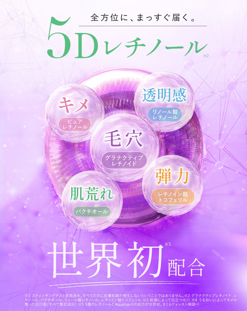 世界初*1「5Dレチノール」*2が、<毛穴*5・キメ・透明感*6・ハリ・肌荒れ予防>5つの効果で、欲張り全方位ケア。
