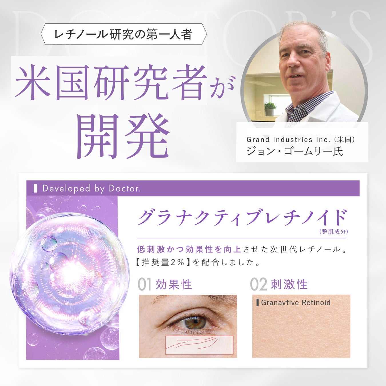 米国の研究者・John Gormley氏が率いる、Grant Industries社が開発した「Granactive Retinoid(グラナクティブレチノイド)」*3を中心に、攻めと守りを備えた「レチノソームショット2.0」を開発いたしました。