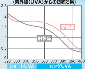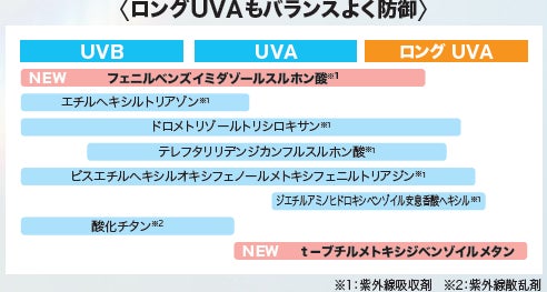 新たなUVフィルターを2種配合し、特に肌の奥まで届き、シミ、ハリ低下、ダメージを引き起こす波長の長いロングUVAをしっかり防御するための設計へ強化。