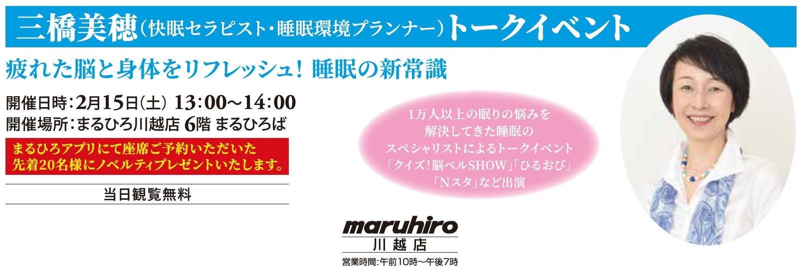さらに2月15日(土)午後1時より、睡眠の専門家である三橋美穂さんを迎えたトークイベントを実施します。毎晩の眠りを深く快適にするための実践的なアドバイスや専門的な知識をわかりやすくお届けいたします。まるひろアプリにて座席をご予約いただいた先着20名様にノベルティプレゼント!皆様のご参加をお待ちしております。
