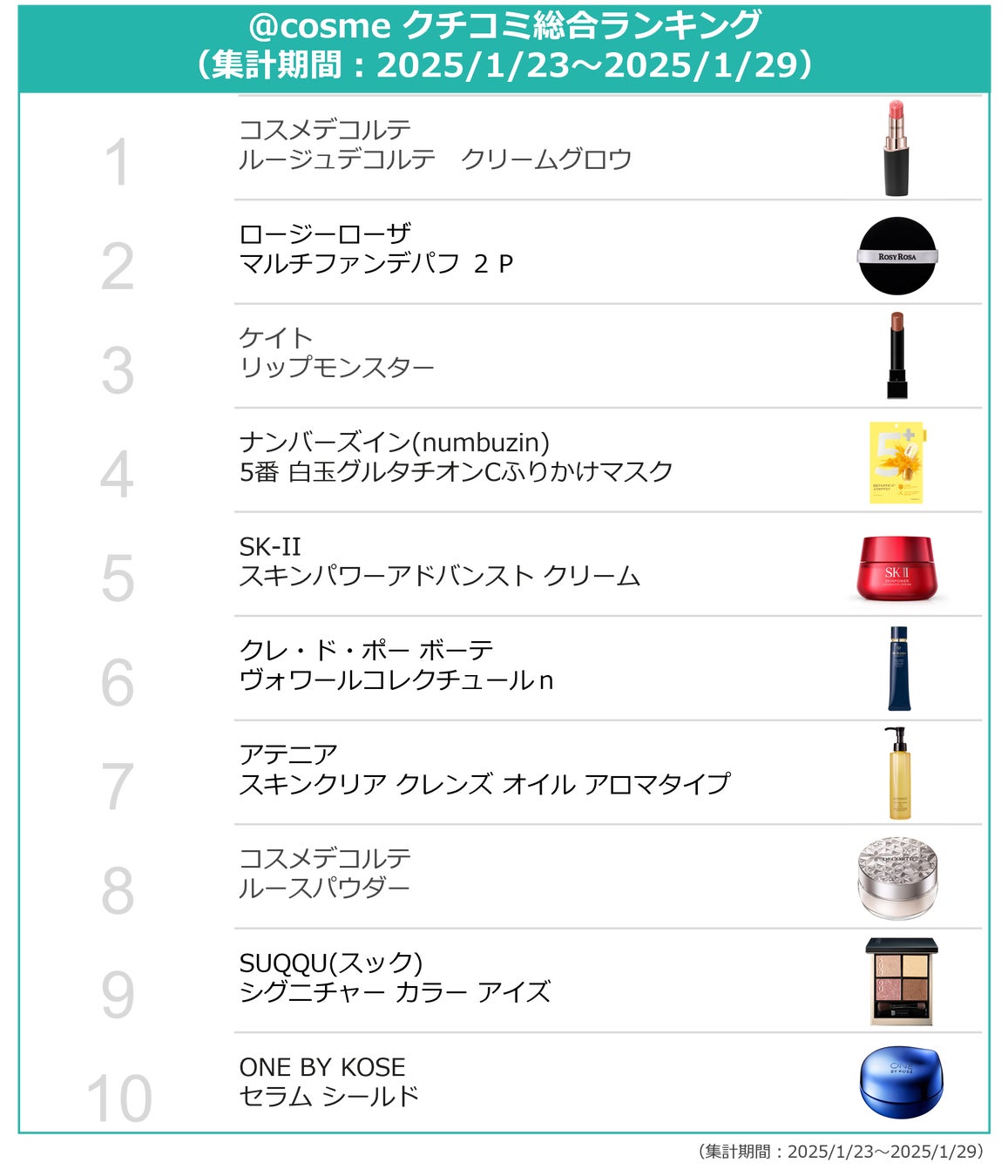 今シーズン最大の大寒波が訪れ、まだまだ寒い日が続きそうな今年の冬。@cosmeのクチコミでは、どのような商品にクチコミがされ注目を集めているのでしょうか。クチコミ総合ランキング(集計期間:2025/1/23~1/29)を見てみると、1位には大人気ブランドコスメデコルテから1/16に発売されたばかりの新作「ルージュデコルテ クリームグロウ」がランクイン。発売早々にクチコミでランキングで1位を獲得していることからもユーザーからの支持の高さがうかがえます。一方、先日新色が発売されたことでも話題の定番人気アイテム「リップモンスター」は3位に躍り出ており、数々のリップアイテムが発売されても人気の揺るがない強さを見せつけています。さらに、2024年12月5日発表のベストコスメアワード2024で総合10位内を受賞したアイテムからもロージーローザ 「マルチファンデパフ 2P」、ナンバーズイン(numbuzin)「5番 白玉グルタチオンCふりかけマスク」、アテニア「スキンクリア クレンズ オイル アロマタイプ」、コスメデコルテ 「ルースパウダー」の4アイテムがランクイン!ベスコスが発表され関心が集まっていることもあってか、ベスコス受賞のアイテムの躍進が目立ちますが、大寒波の影響もあって、シートマスクやフェイスクリームなど保湿アイテムへの注目も感じさせるラインナップとなりました!