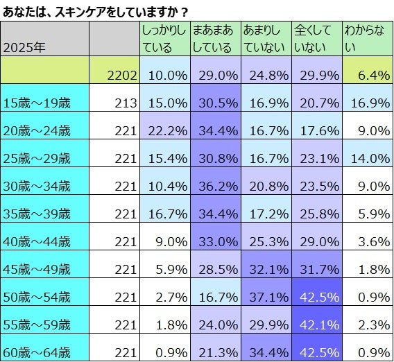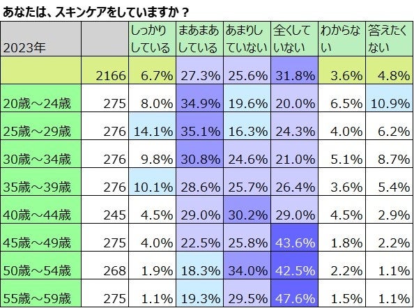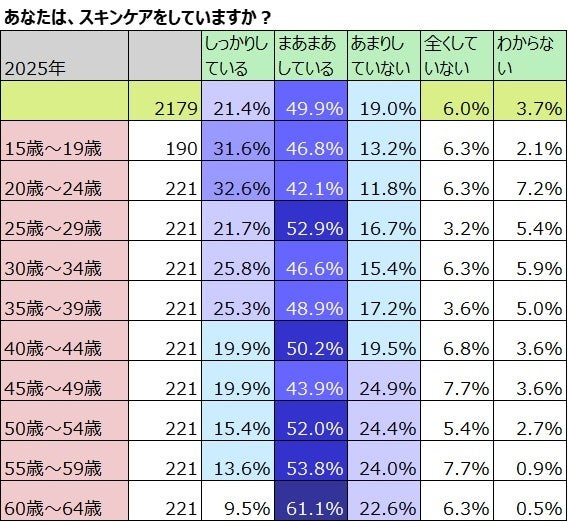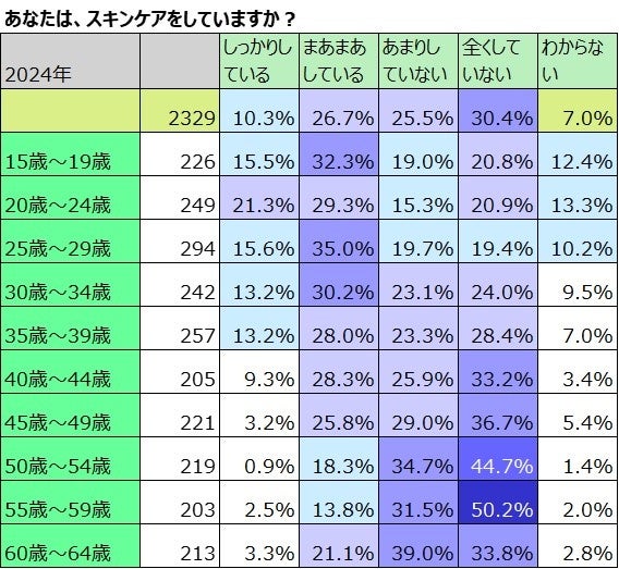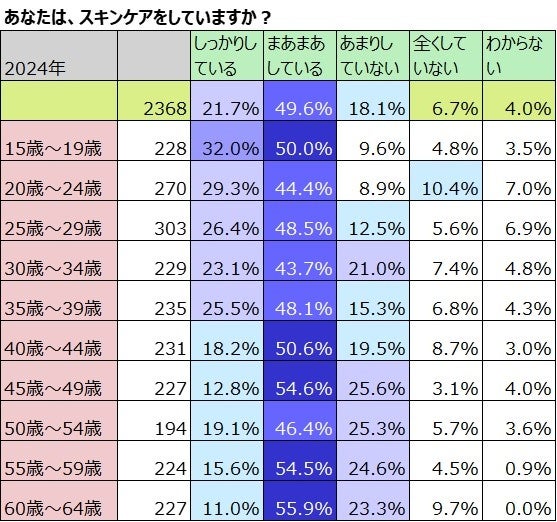 全国の15歳~64歳の男性2,202名と女性2,179名の合計4,381名にスキンケアをしているか否か聞きました。また、2024年1月実施(15歳~64歳 男性2,329名と女性2,368名の合計4,697名)と、2023年1月実施(20歳~59歳 男性2,166名と女性2,201名の合計4,367名)の調査内容と比較してみました。スキンケアや美容への関心のジェンダーレス化や高齢者のPC操作のスキルの向上に伴い、2024年度からは調査対象の年齢を広げていますので、すべてを同条件で比較することはできていません。