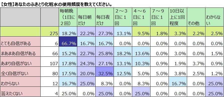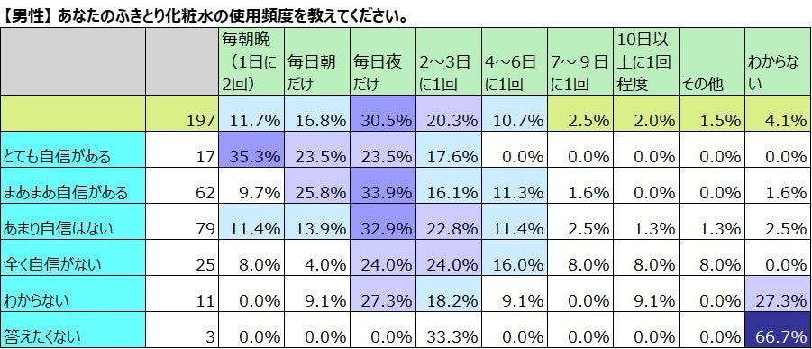 これを肌への自信と使用頻度でかけ合わせて見てみました。Nが少ないため、参考値ではありますが、男女ともに1日に1回以上使用している方が肌への自信があると答えています。特に、女性の方が自信があると答えている割合が高い傾向がみ受けられました。