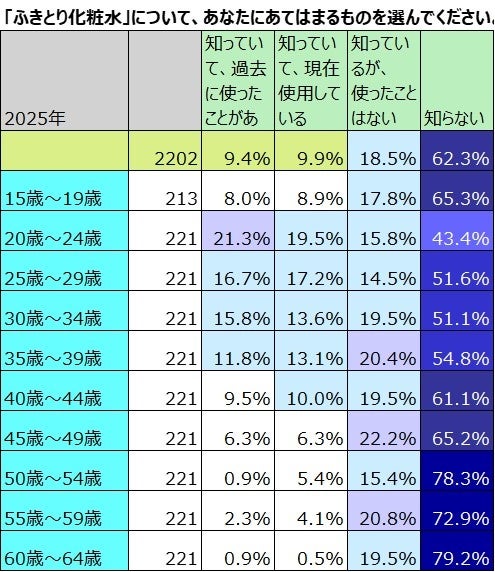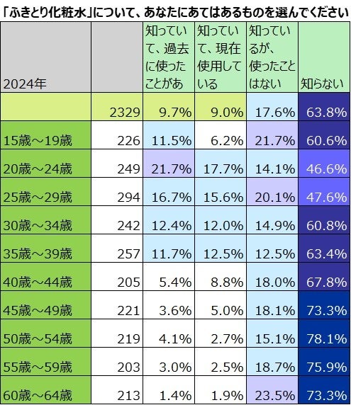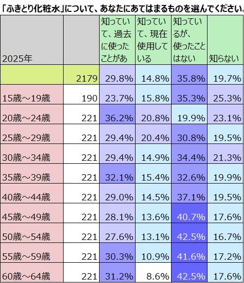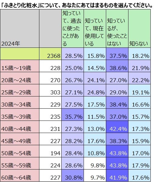 ふきとり化粧水の認知率、使用経験は横ばい。