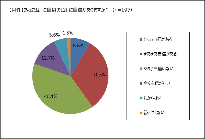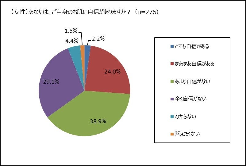 ここからは、調査においてふきとり化粧水を使用したことがあると答えた人のうち、197名の男性と275名の女性に追加調査を行った内容をまとめます。まず、ご自身の肌について自信があるか否か聞きました。男性は、「とても自信がある」8.6%、「まあまあ自信がある」31.5%を合わせた40.1%が自信があると答えています。一方で女性は、「とても自信がある」2.2%、「まあまあ自信がある」24%で合わせた26.2%が自信があると答えており、男性の方が自信がある人の割合が高いことがわかりました。
