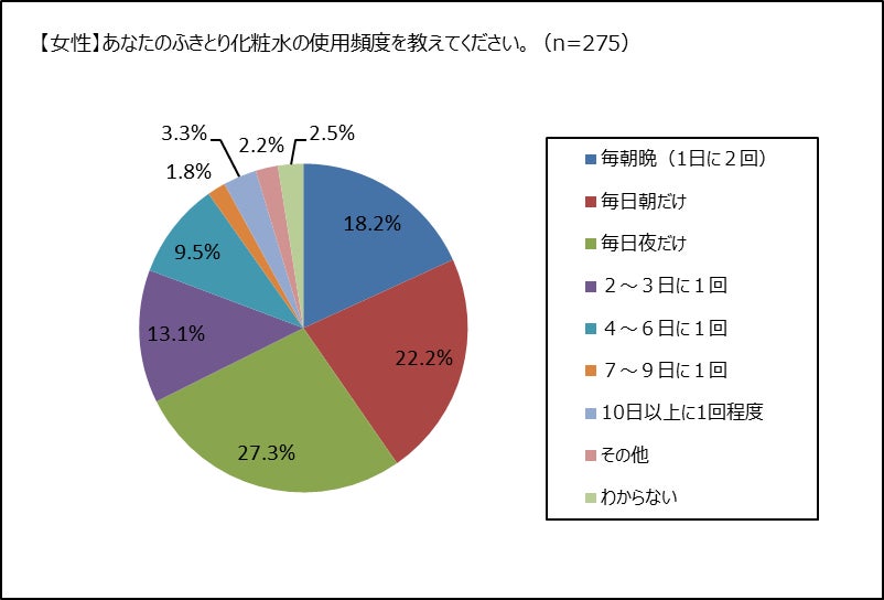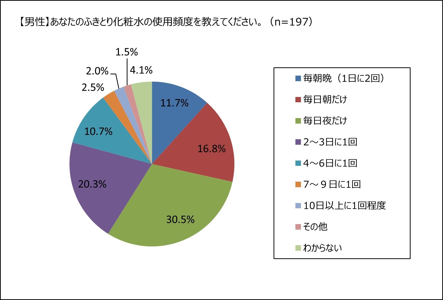 ふきとり化粧水の使用頻度を聞きました。男性は、「毎朝晩(1日に2回)」が11.7%、「毎日朝だけ」が16.8%、「毎日夜だけ」が、30.5%で、1日に1回以上使用している人は59%でした。女性は「毎朝晩(1日に2回)」が18.2%、「毎日朝だけ」が22.2%、「毎日夜だけ」が27.3%で、1日に1回以上使用している割合は67.7%でした。女性の方が使用頻度が多いようです。
