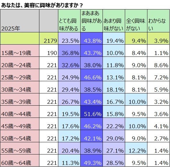②「美容に興味がある」増加しているのは男女ともに30代~40代。