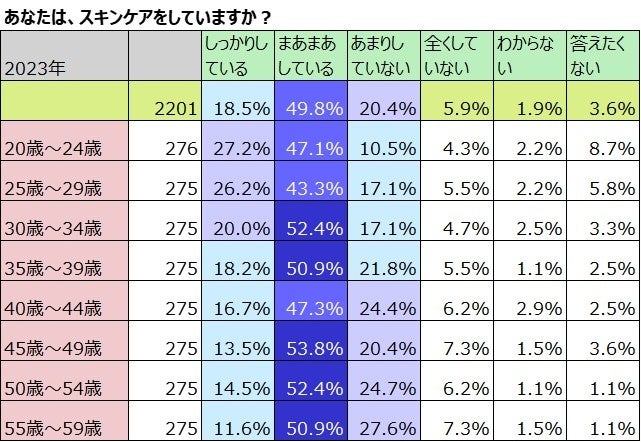 次に女性に聞いた結果を見てみます。全体では「しっかりしている」21.4%と「まあまあしている」49.9%を合わせた71.3%が「している」と答えており、昨年の「しっかりしている」21.7%「まあまあしている」49.6%の「している」71.3%と全く同率です。2023年は、「しっかりしている」18.5%「まあまあしている」49.8%「している」68.3%で横ばいと言えます。最も「している」のが多いのは、10代後半で78.4%、昨年の82%よりも少し減少しているものの10代後半が最も多いのは傾向として変わりません。女性は3年間を通して意識の変化はほとんど見られませんが、10代後半から20代前半の若年層において「しっかりしている」と答える割合が、30%を超えており、特に20代前半で27.2%から32.6%と5ポイント以上増加しており、スキンケア習慣や意識の低年齢化傾向が見られます。特に女性のスキンケア意識は、コロナ禍など大きな環境変化によるもの以外は、1年単位の調査では傾向を見ることが難しいため、細かな変化や複数年に渡る調査によって、その変化を感じることができると考えます。