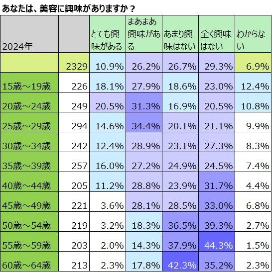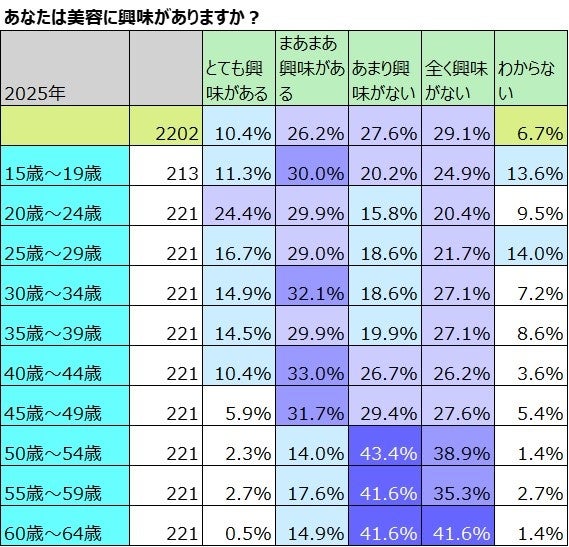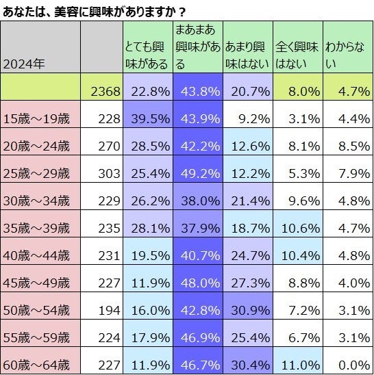 次に女性の美容への興味関心を見てみます。全体では「とても興味がある」23.5%「まあまあ興味がある」43.8で「興味がある」のは67.3%でした。昨年は「とても興味がある」22.8、「まあまあ興味がある」43.8%で「興味がある」のは66.6%だったので、女性も横ばいと言えます。年齢別に見てみると、10代後半から20代後半は、20代前半の70.6%の同率を除いては、微減傾向にあり、30代~50代前半までが上昇していることがわかります。最も増加しているのは40代前半で60.2%から71.1%と約10ポイントの増加です。全体の興味関心は横ばいながら、30代~40代の中高年層の興味関心が増加していることが、市場に大きく影響を与えていることが想像できます。