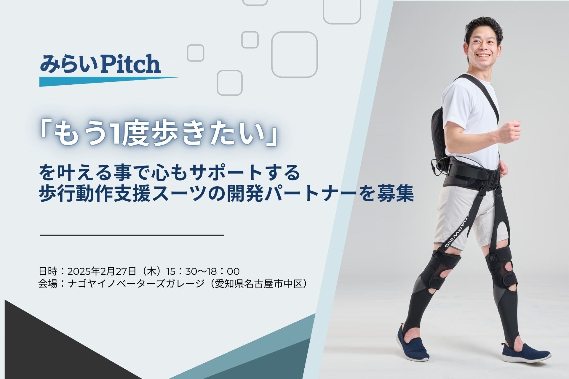医療用品メーカーのダイヤ工業株式会社(本社:岡山県岡山市 代表取締役:松尾浩紀)は、2025年2月27日(木)にナゴヤイノベーターズガレージ(愛知県名古屋市中区)にて開催される「地域未来牽引企業の成長に向けた共創を促進する新事業創出プロジェクト第2回『みらいPitch』」に登壇いたします。本イベントを通して、現在取り組んでいる「歩行動作支援スーツ」の開発パートナーを募集いたします。