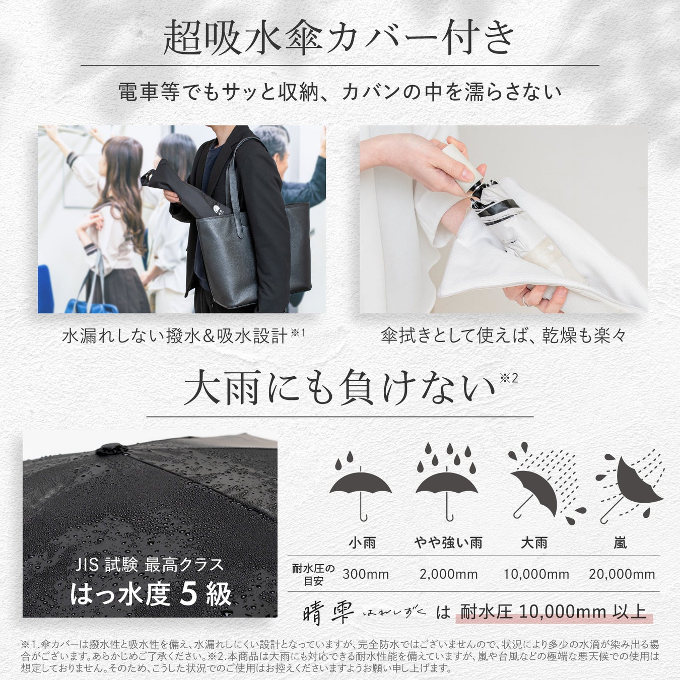 日本工業規格(JIS)で最高ランクの撥水度5級。雨水をしっかり弾き、雨傘としても使用可能。