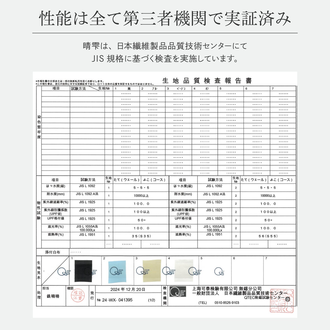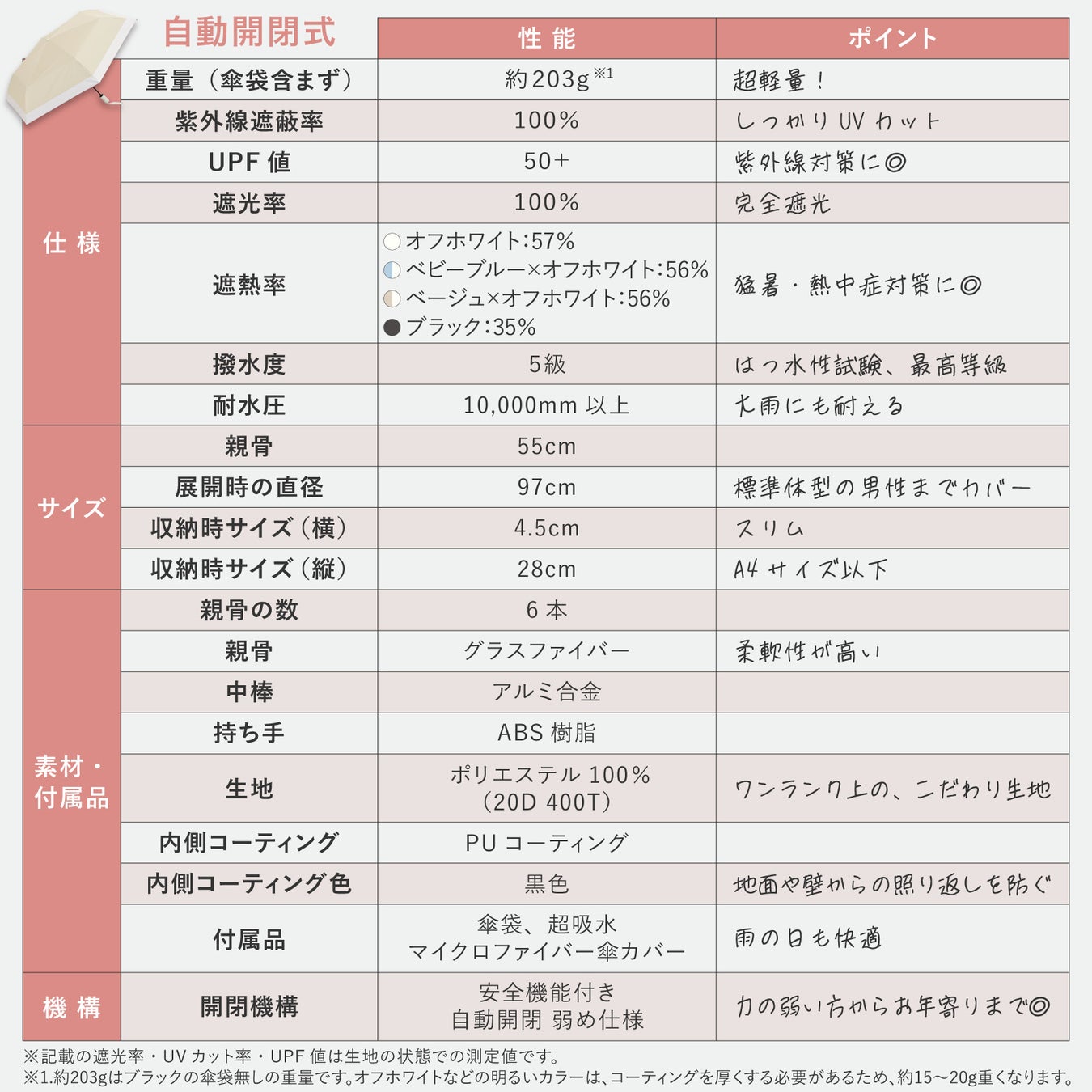 性能:UVカット率100%、遮光率100%、撥水度5級(耐水圧10,000mm以上)