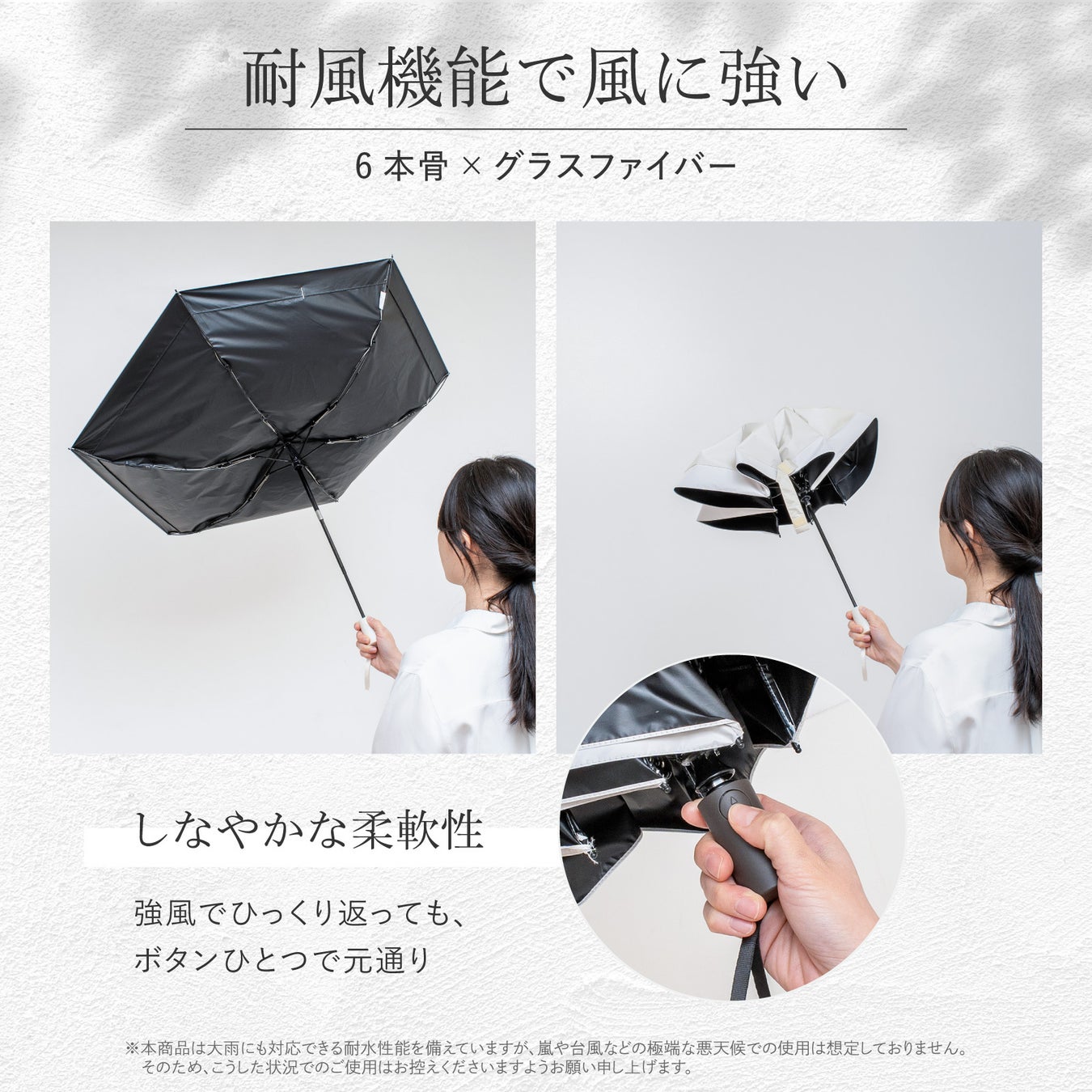 耐風性能に優れたフレーム設計で、強風で傘が裏返っても簡単に元通りに戻る柔軟な構造。