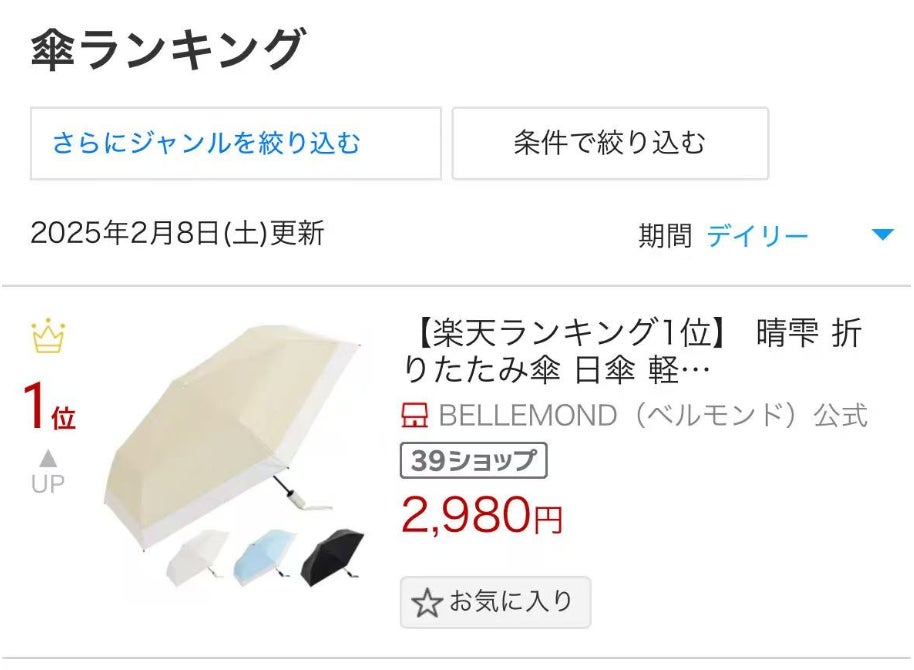 楽天市場の「傘カテゴリ」や「晴雨兼用傘カテゴリ」において、予約販売中でありながら1/31発表からほぼ毎日1位を受賞。