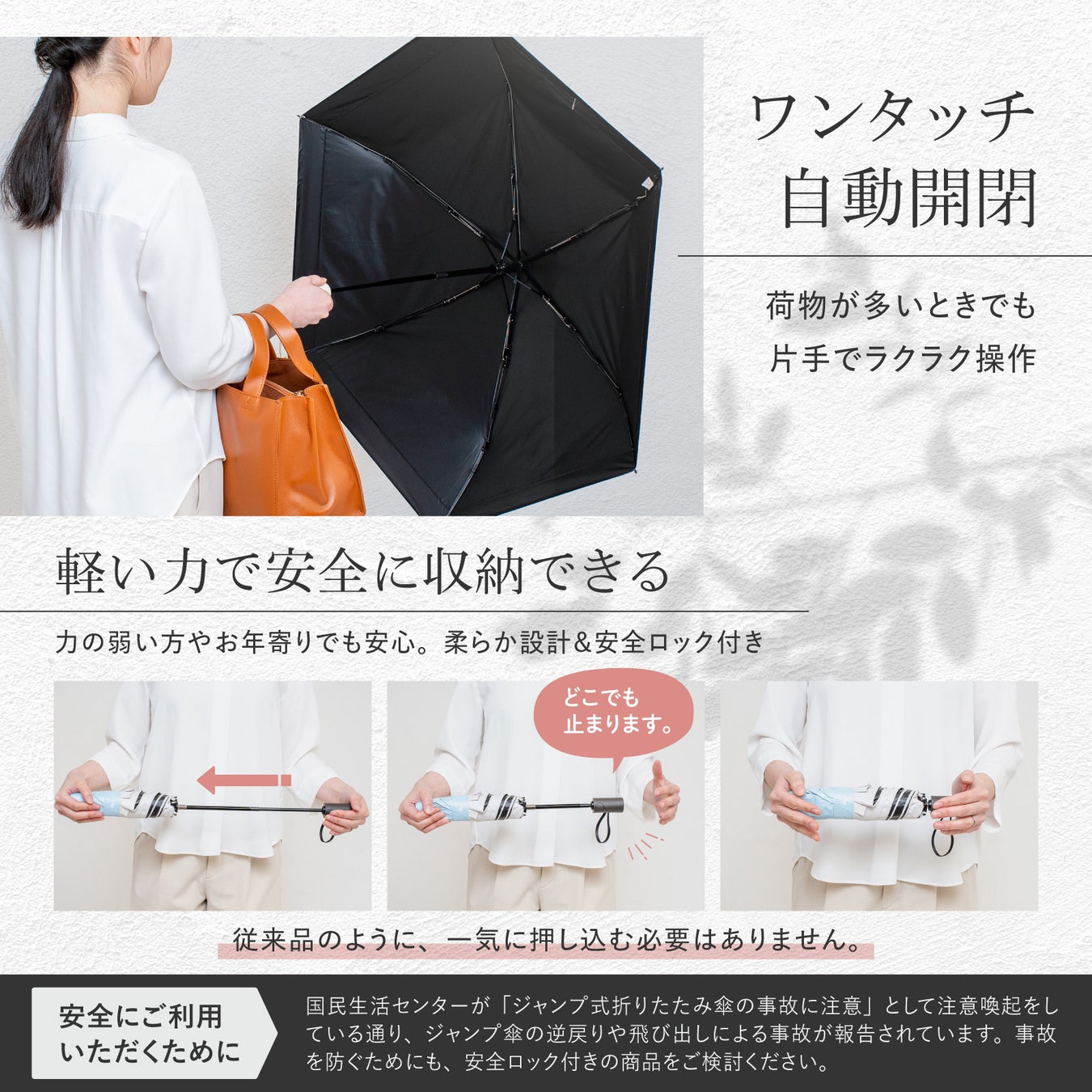 収納時の逆戻りを防ぐ安全ロック機能を搭載し、安心して収納が可能。