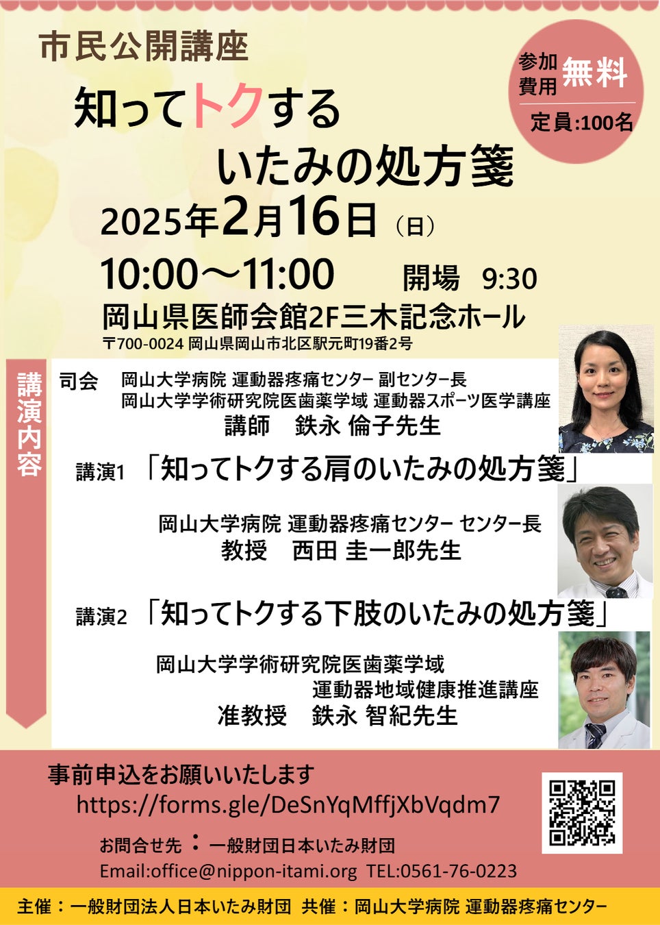 国立大学法人岡山大学(本部:岡山市北区、学長:那須保友)の岡山大学病院が共催で、一般財団法人日本いたみ財団とともに市民公開講座「知ってトクするいたみの処方箋」を、20252月16日(日)10:00~11:00に岡山県医師会館2F三木記念ホールで開催します。