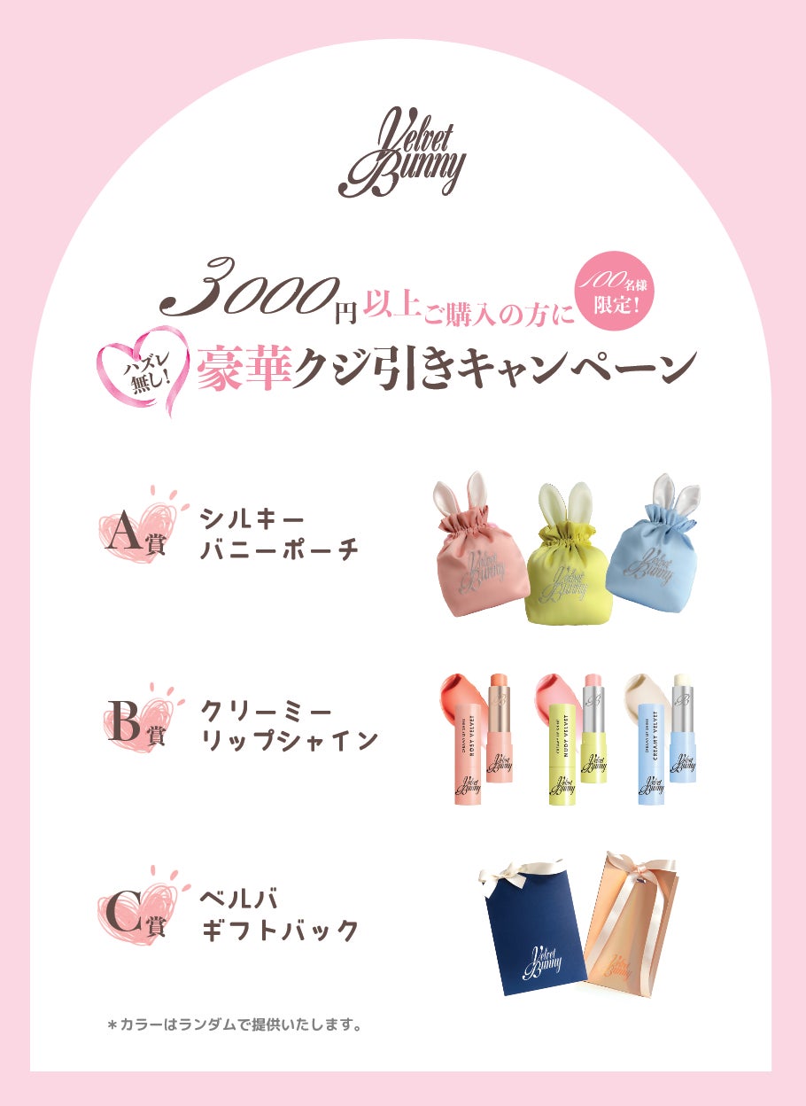 ハズレ無しのこのキャンペーンでは、大人気のうさぎ耳の形をしたバニーポーチやリップクリームなど、豪華な景品をご用意しております。