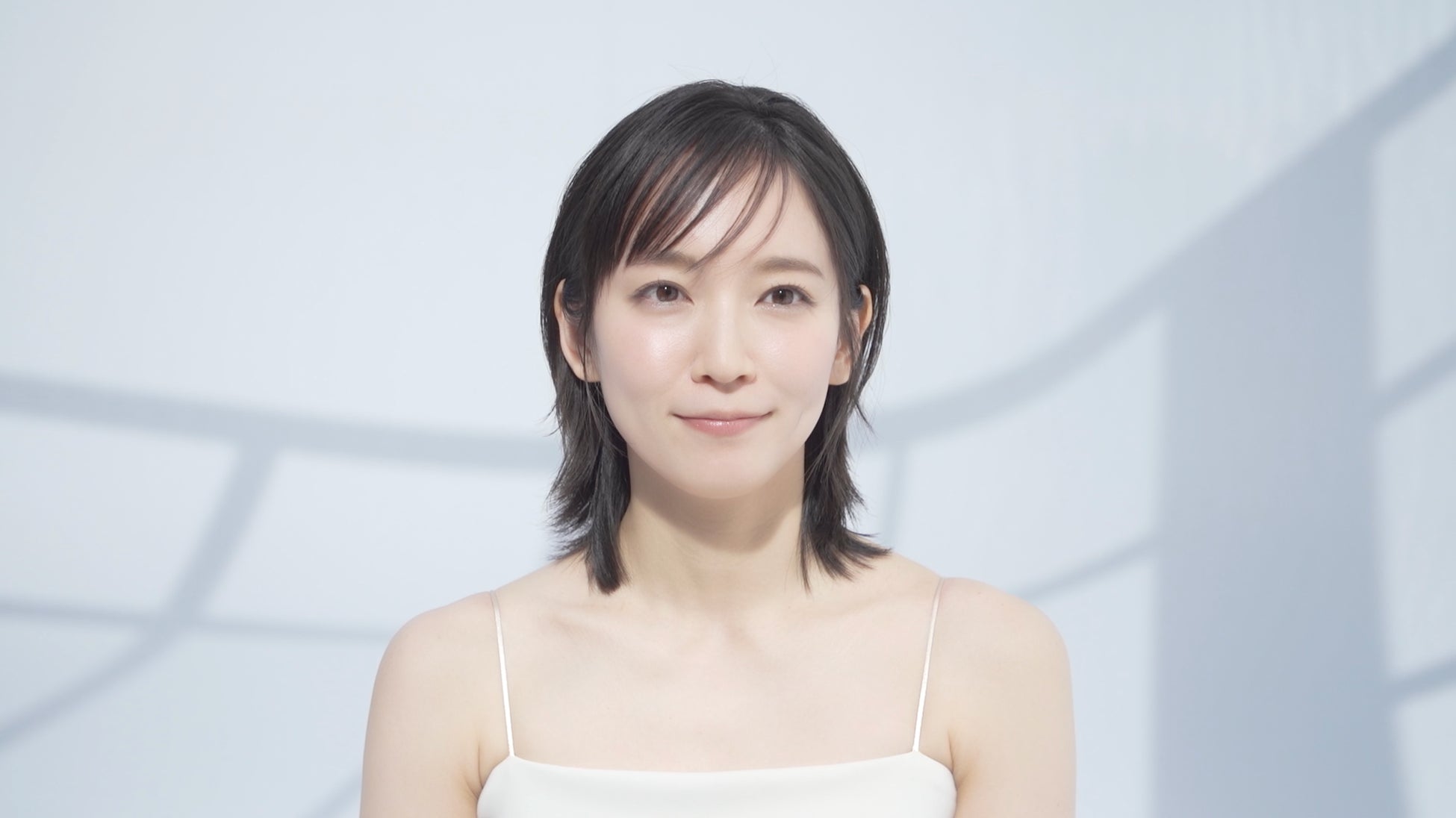 自然光が差し込む真っ白なスタジオに座っている吉岡さん。カメラを見つめる、凛とした表情からCMはスタートします。