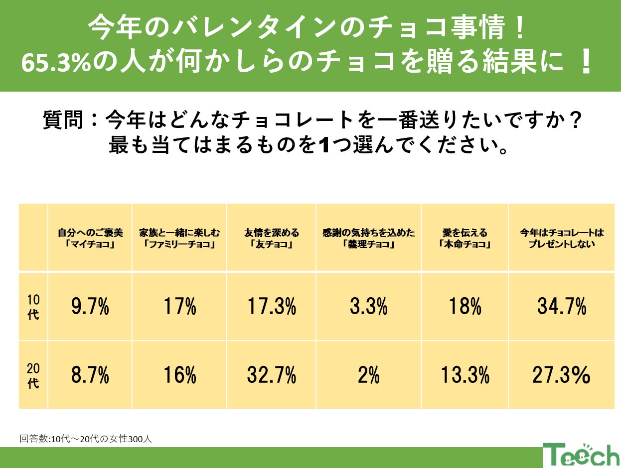 2月14日はバレンタインデー。多くの人がチョコレートを贈り合うこの日、どのようなチョコレートを選ぶかは人それぞれです。今回のアンケートでは、10代から20代の女性に「今年一番送りたいチョコレート」について調査しました。