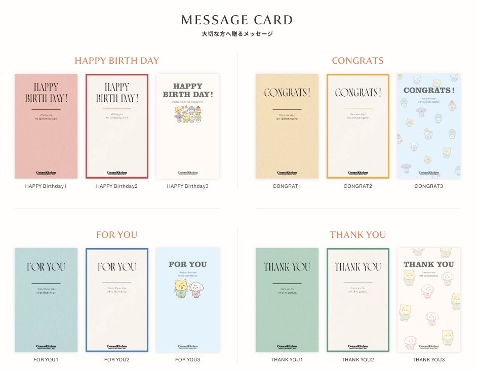 また、「eギフト」サービスでギフトを贈る際にお選びいただける「デジタルメッセージカード」は、コスメキッチンのオリジナルデザインをご用意しました。誕生日や出産祝いのギフトなど、シーンに合わせて大切な人へ気持ちを添えるデジタルメッセージカードを一緒に贈ることができます。