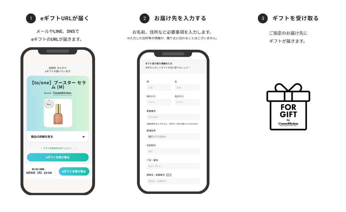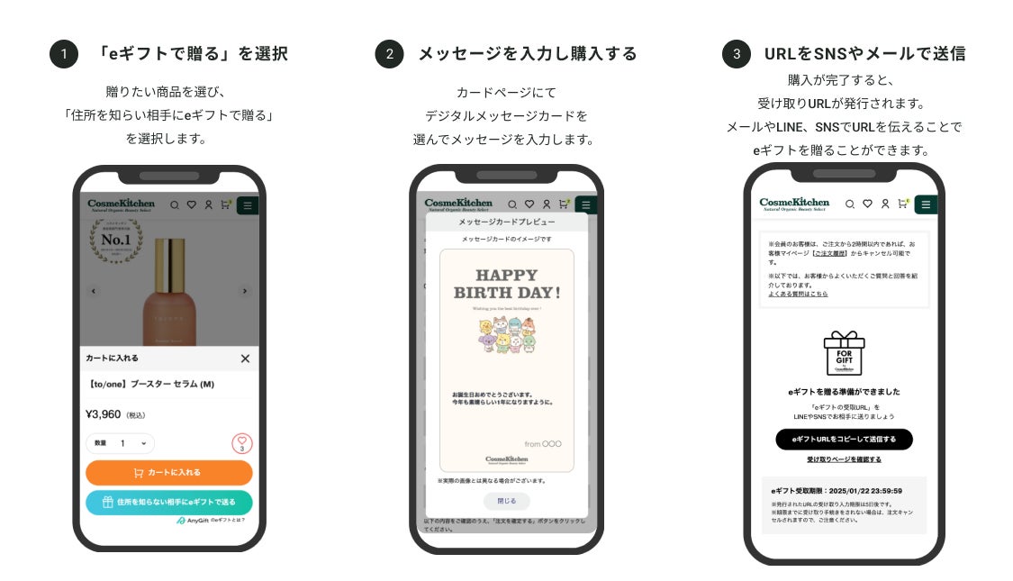 相手の住所がわからなくても誕生日や出産祝いのギフトを贈れる「eギフト」サービスを開始。コスメキッチンのオリジナルデザインのデジタルメッセージカードで大切な人への気持ちもお届け。