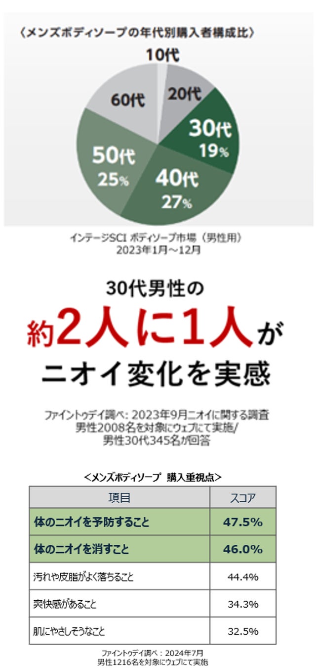 男性のニオイケアへの意識の高まりと共に、制汗剤市場だけではなく、成長し続ける男性用ボディソープ市場。ファイントゥデイが実施した調査によると、購入価格帯においても、700円以上の商品購入の構成比が66%(※4)と高く、価格帯が上がっても男性に向けた機能を求めていることがわかっています。また男性用ボディソープ購入者を年代別にみると、30代~50代が約70%(※5)と高い割合であることもわかりました。年代によって気になるニオイは異なるものの、30代の男性の2人に1人が何らかの「ニオイの変化」を感じているという調査データ(※6)もあり、30代から「男性用」の使用者が増加傾向である背景には、今まで感じにくかった「ニオイ」に関しての悩みを感じ始めるということを示唆しています。