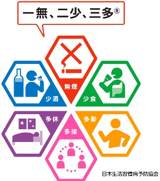 『一無、二少、三多』は、一無:無煙・禁煙、二少:少食、少酒、三多:多動、多休、多接の6つの健康標語から構成され、日常心がけたい生活習慣をわかりやすく、より実践的に表現した健康標語です。当協会の顧問、池田義雄が1991年に提唱し、当協会が普及啓発に努めています。