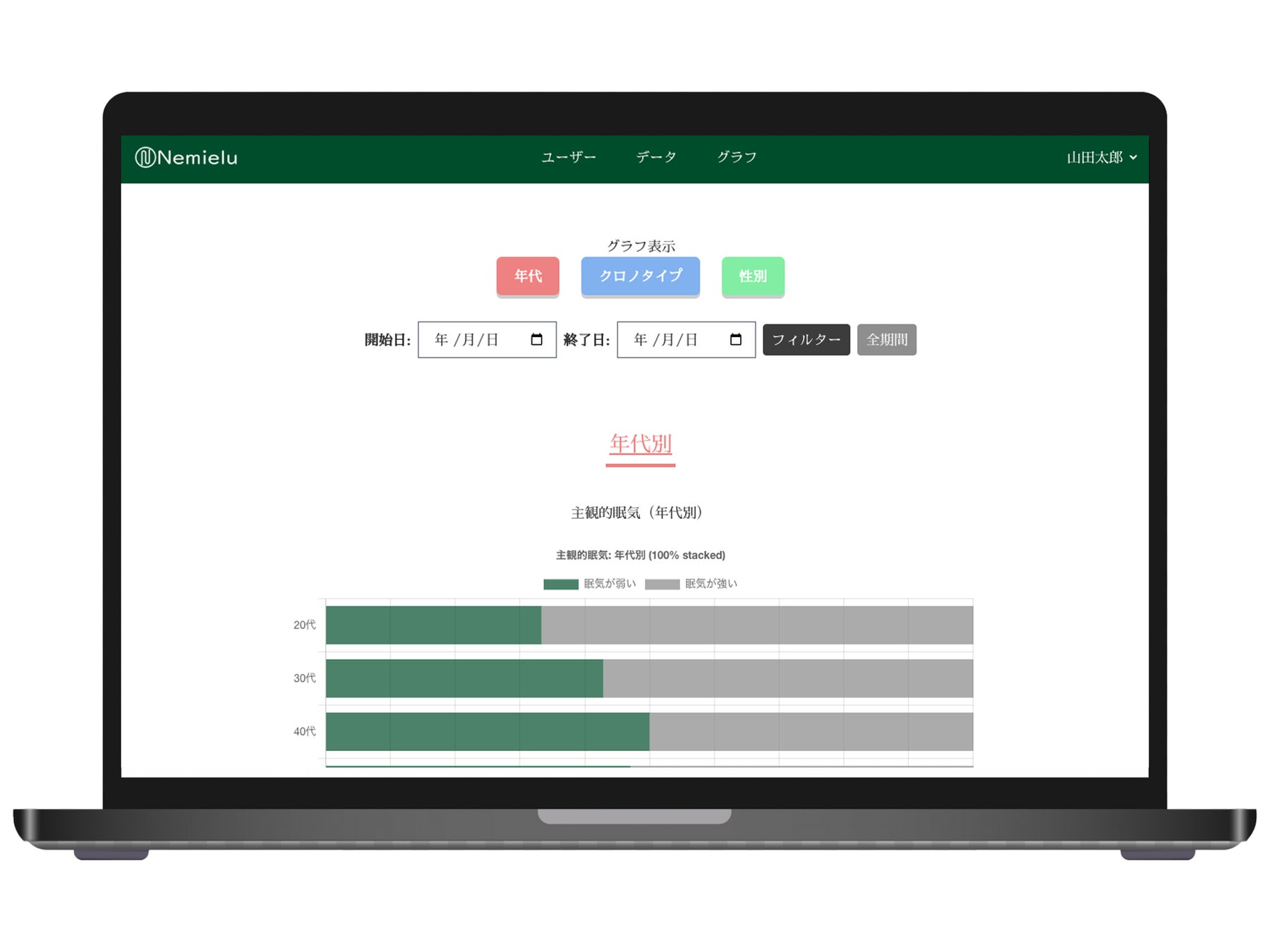 これまでのシステムは、ユーザー管理を目的とした最低限の機能のみを提供していました。新しいシステムでは、各ユーザーのデータをセグメントごとに閲覧できるようになり、さらにグラフ機能を活用することで、視覚的に睡眠課題のあるセグメントを把握しやすくなりました。