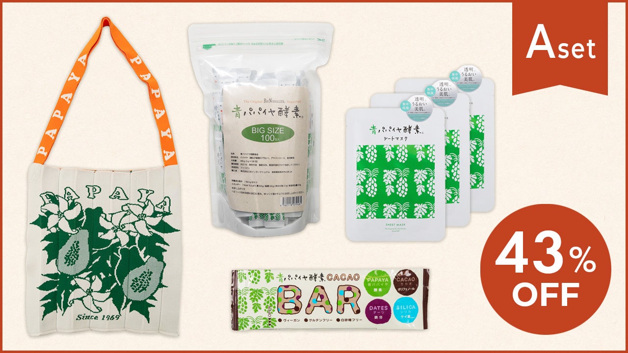 期間限定販売の大容量の青パパイヤ酵素顆粒タイプ100包とシートマスク、カカオバーが入ったAセット。
