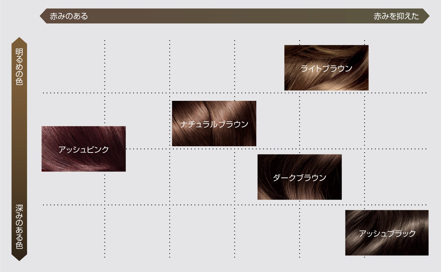 今回発売となる新色「アッシュピンク」は、深みのある上品なくすみピンクで、肌なじみがよく柔らかな透明感をプラスします。血色感のある若々しい印象を与えることができるピンク系カラーは、白髪染めでもおしゃれに楽しみたい大人女性に人気のカラーの1つです。既存のカラーと合わせ全5色展開となり、暗髪から明るめ、ナチュラルカラーやアッシュなど、より幅広いラインアップになっています。