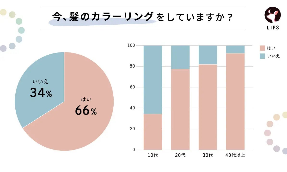 20代では約80%の女性がヘアカラーリングをしていると回答。また、40代以外の女性の半数以上が「自己表現」のためにヘアカラーリングをしていると回答。