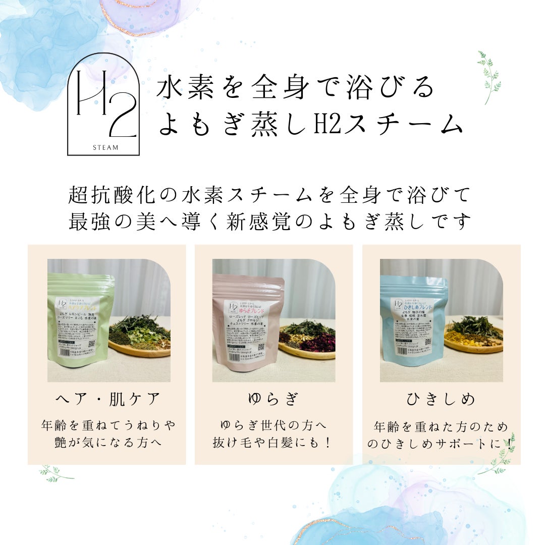 1.特殊加工した水素をハーブ類に加えることでよもぎ蒸しをしながら水素(50~100ppmほど)を含んだ蒸気を浴びることができる