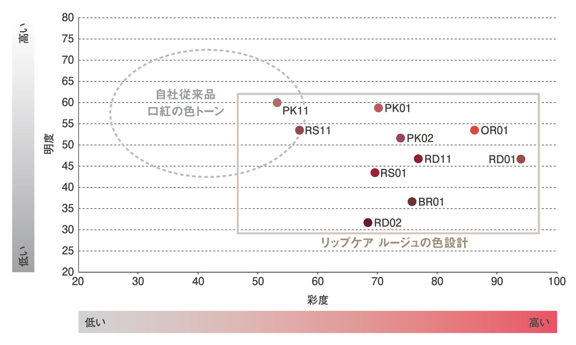 カラーは、敏感な肌や唇の色を考慮し、明度を抑えて彩度を高めに調整した色設計を採用。