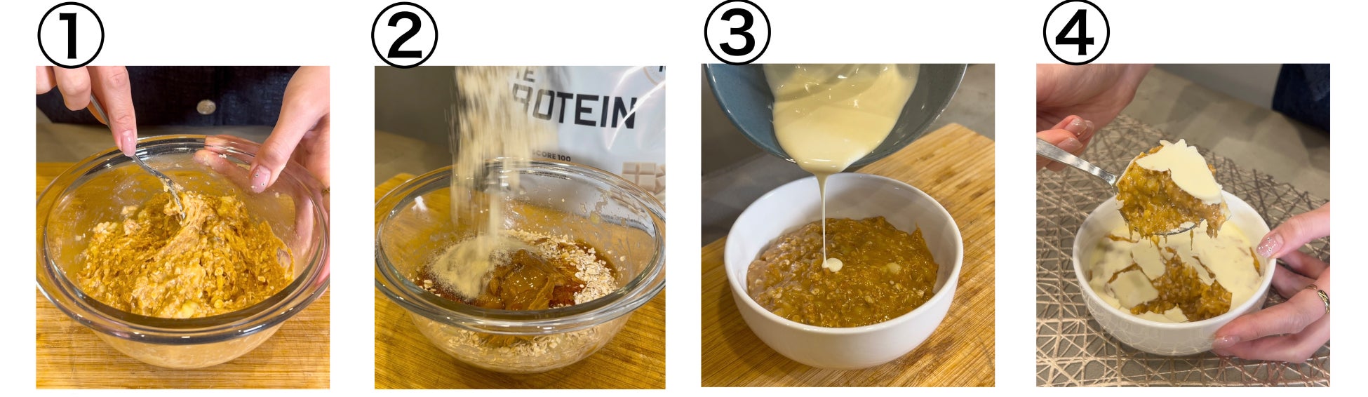 ②オートミール、プロテインも入れてもう一度混ぜる。(オートミールはものによって水分の吸収率が変わるので、生地がねっとりする位で調節してみてね!)