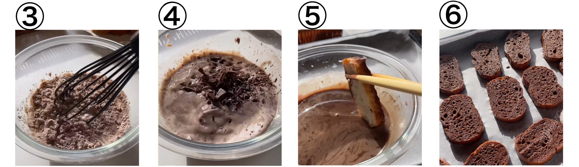 ⑤チョコレート液にカットしたフランスパンをサッとくぐらせる。