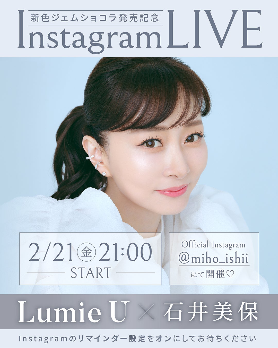 新色GEM CHOCOLAT(ジェムショコラ)の発売日2月21日(金)21:00頃より、『Lumie U(ルミエユー)』プロデューサーを務める石井美保さんが出演する「Lumie U×石井美保 Special Instagram Live」を実施いたします。