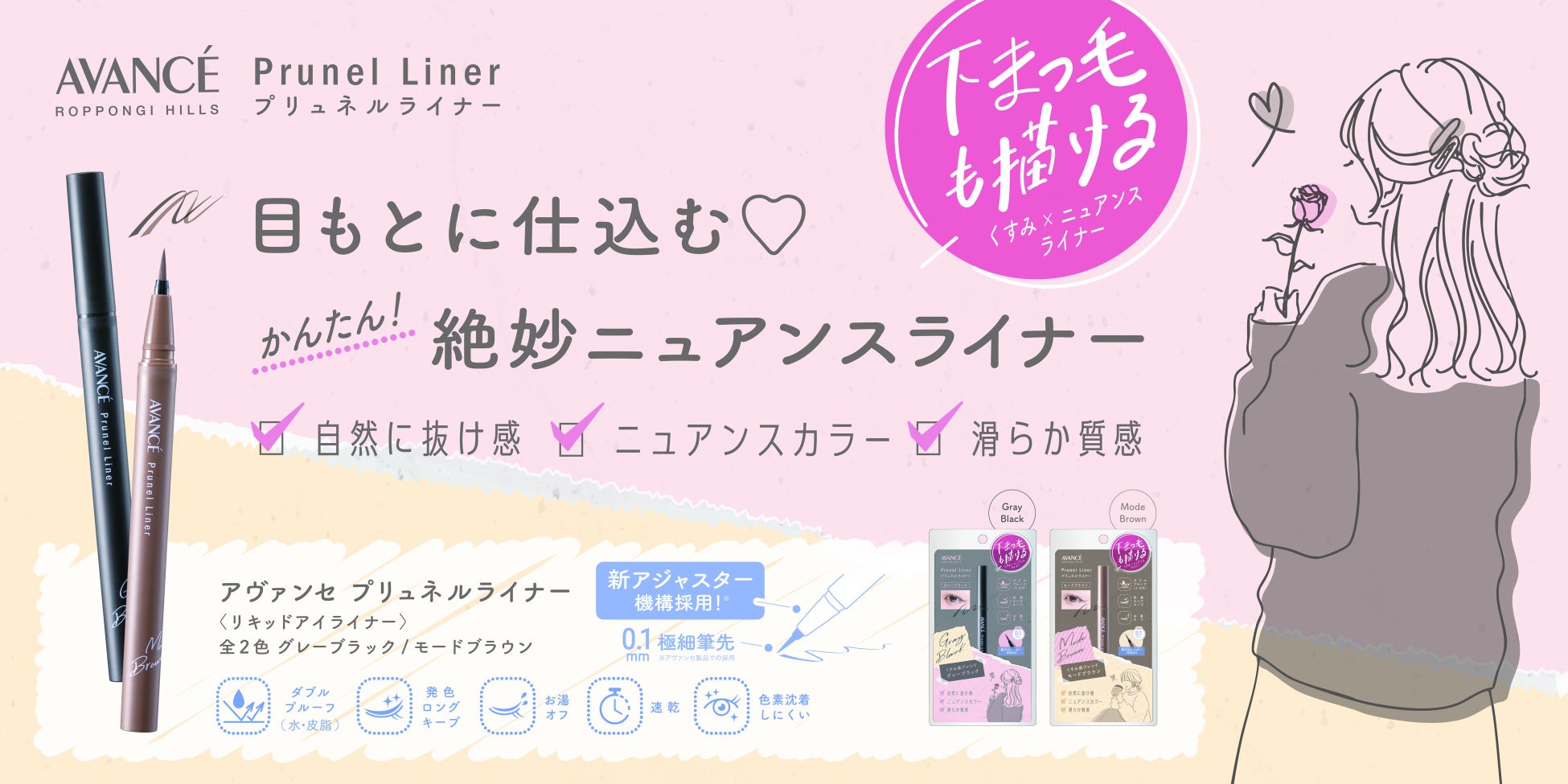 新アジャスター機構採用により究極な抜け感を演出できるニュアンスカラーを実現。極細筆先で下まつげも描けます。