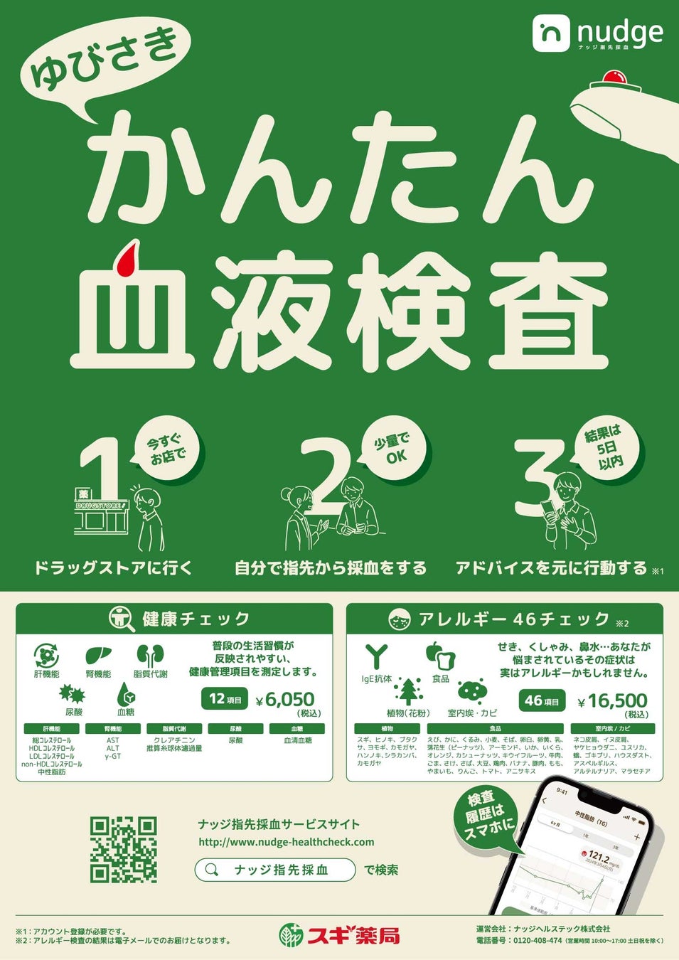 ナッジヘルステック株式会社は、本日2025年2月17日(月)より順次、株式会社スギ薬局の東京店舗(中野大久保通り店)と大阪店舗(KITTE大阪店、豊崎店、天王寺駅西店、せんば心斎橋店、クリニックモールなんば店)の調剤窓口にて指先採血検査「nudge指先採血」のサービス提供を開始いたします。