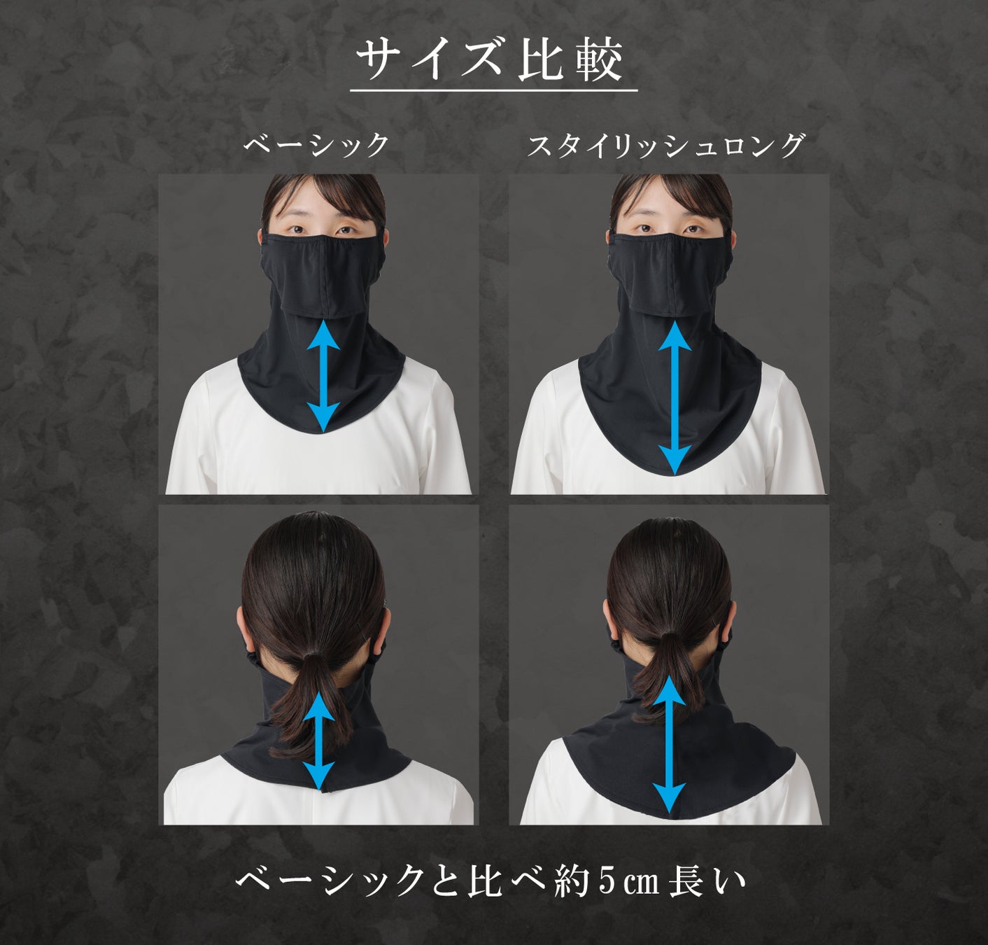 「スタイリッシュロング」は「ベーシック」に比べて首元が約5cm長く、デコルテまでしっかりカバー。より広範囲を守れるデザインです。