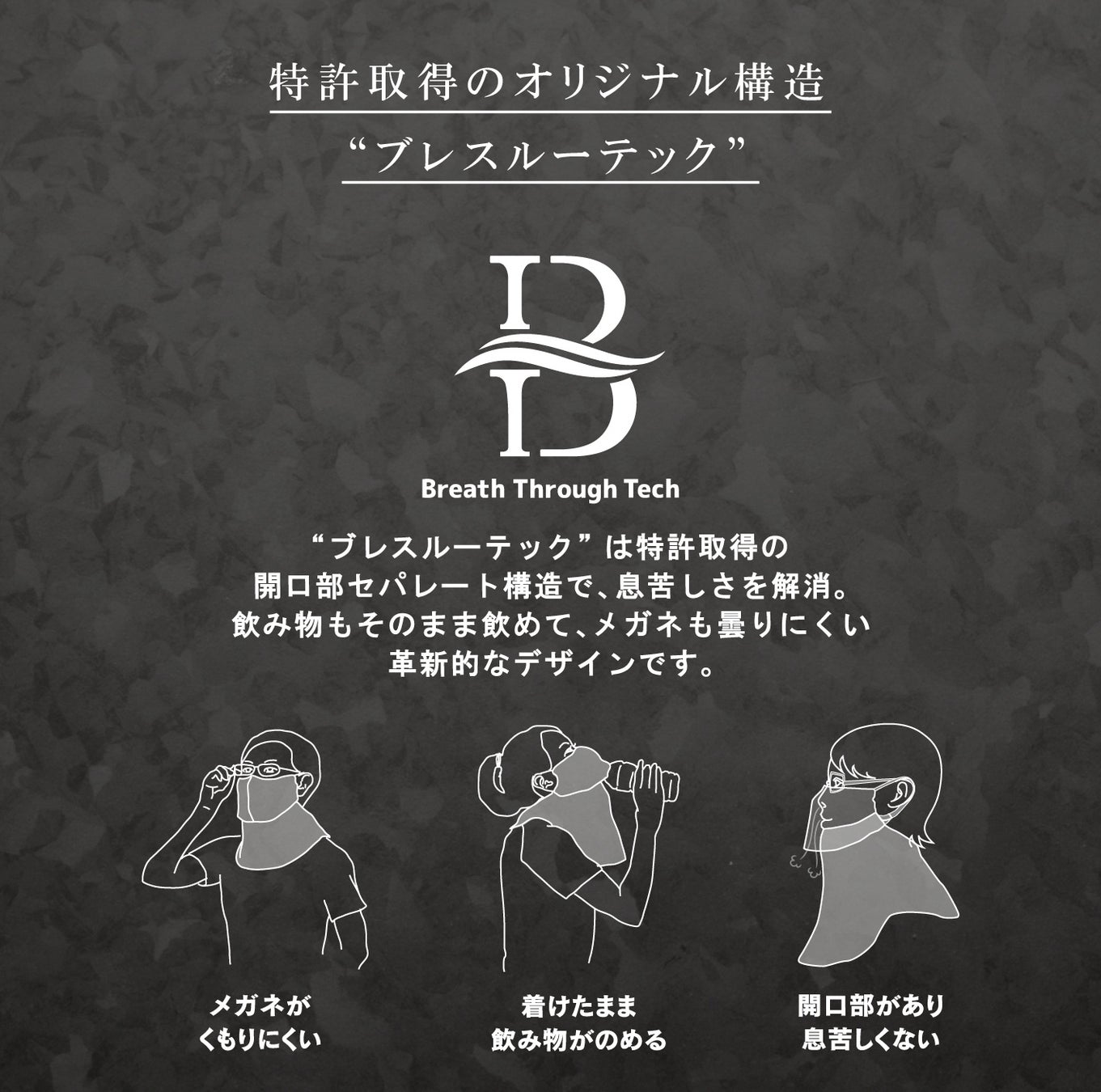 息苦しさを回避するための上下二部式の構造。ゆったりとした開口部を設け、吐いた息が下に抜けるよう設計され、水分補給やメガネの曇り防止にも役立つ設計です。