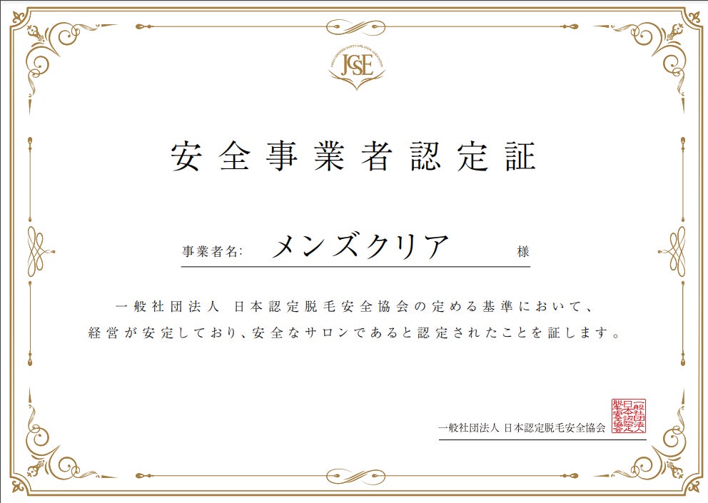 メンズクリアは、2024年に一般社団法人日本認定脱毛安全協会が定める厳しい基準を満たし、「安全事業者認定」を取得しました。認定の付与条件:直近3期連続で黒字経営*⁴であること、直近3期に取引先への支払滞納がないこと