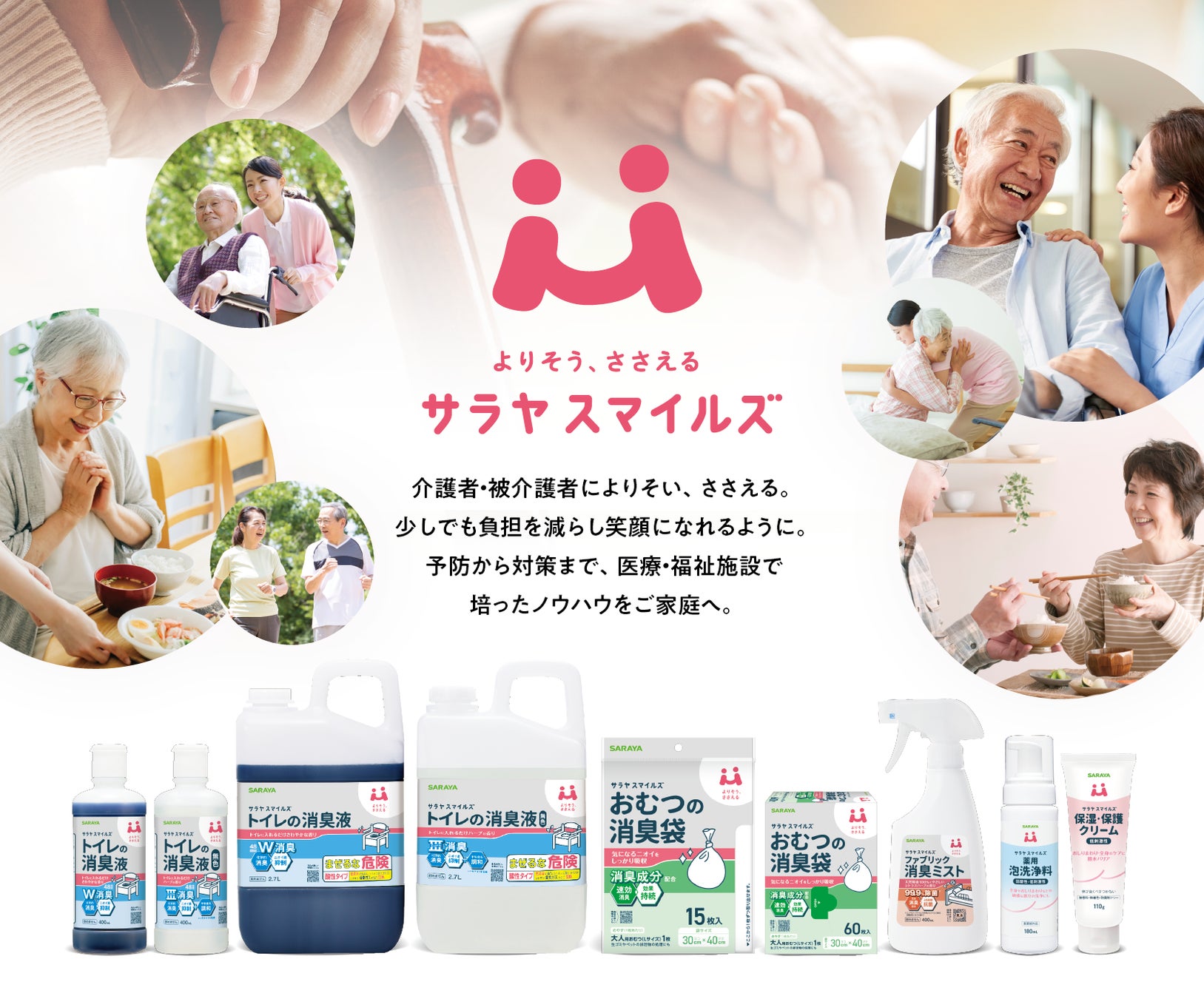 「サラヤスマイルズ」というブランド名には、介護者・被介護者の自分らしい暮らしに寄り添い、快適に過ごせる製品の提供によって笑顔をふやしたいという想いが込められています。
