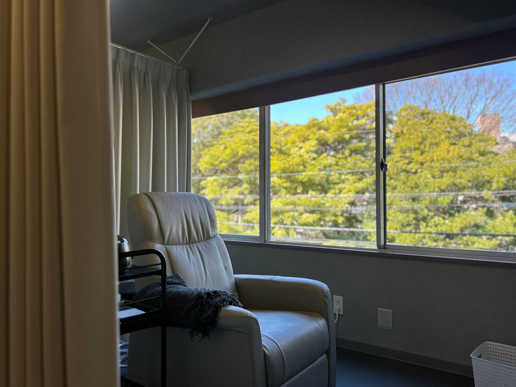 サロンの大きな窓からは自然豊かな公園が見え、リラックスしていただける空間になっております。また施術スペースはカーテンで仕切られているので、他のお客様が見えないような設計になっています。