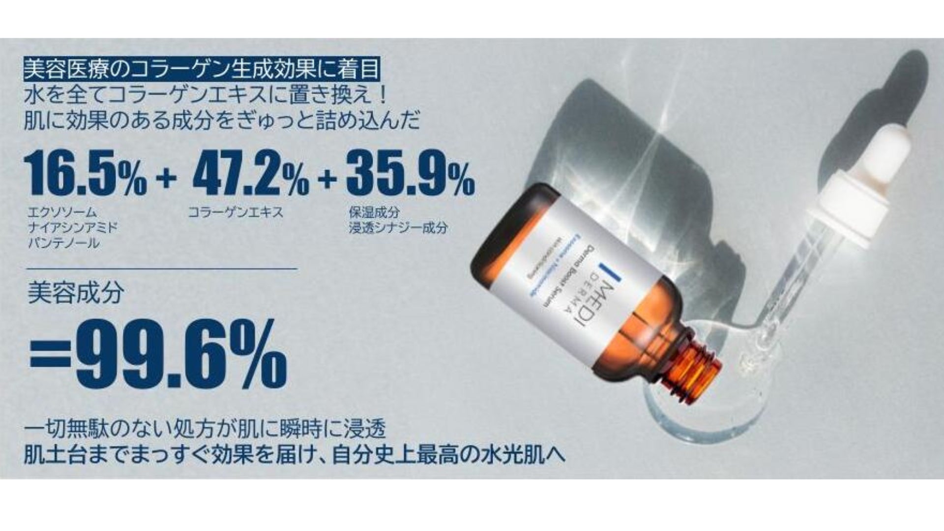 「メディダーマ」シリーズは美容医療発想のスキンケアシリーズとして2024年秋にデビューいたしました。その第三弾として美容成分99.6%の高濃度美容成分が肌土台※1まで瞬時に浸透しハリツヤを注入する水光肌管理セラム「メディダーマ ダーマブーストセラム」を発売いたします。昨今美容医療に対する興味関心が高まっており、肌の土台へ無駄なく美容成分を届ける美肌注射などの施術が人気を博しており、自宅でも手軽により効果のある美肌ケアを行いたいというニーズも高まっています。本商品はシナジー効果を最大限発揮する「攻めの高濃度成分」に加えてうるおいをブーストするサポート成分※2を贅沢に配合。美容医療のコラーゲン生成効果に着目し、水の代わりに47%のコラーゲンエキスを配合。水を使用しない濃厚テクスチャーでありながら塗った瞬間から吸い込まれるような唯一無二の使用感を実現いたしました。