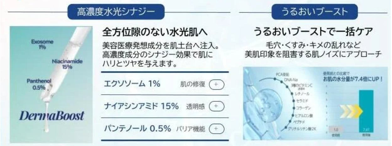 高濃度成分のシナジー効果でハリツヤ注入!毛穴やくすみなどの水光肌印象を阻害する肌ノイズをうるおいブーストで一括ケアすることで全方位隙のない水光肌へ