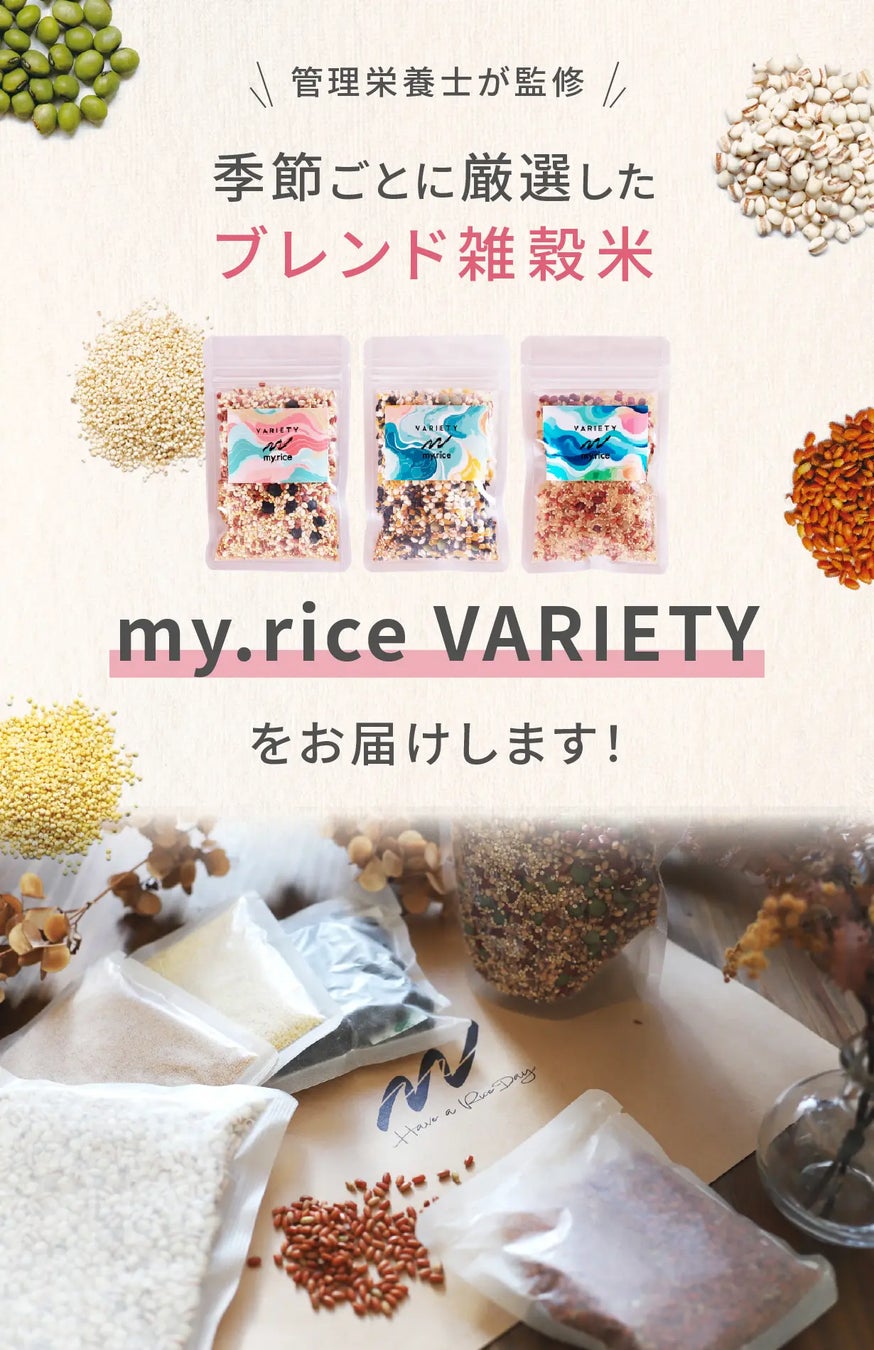 「my.rice VARIETY」は、様々な雑穀のラインナップを揃え、組み合わせによってどのように栄養素が変化するかをデータ化し、管理栄養士の監修のもと、目的に合った雑穀の組み合わせを模索し続けた結果、最高のブレンドに辿り着きました。