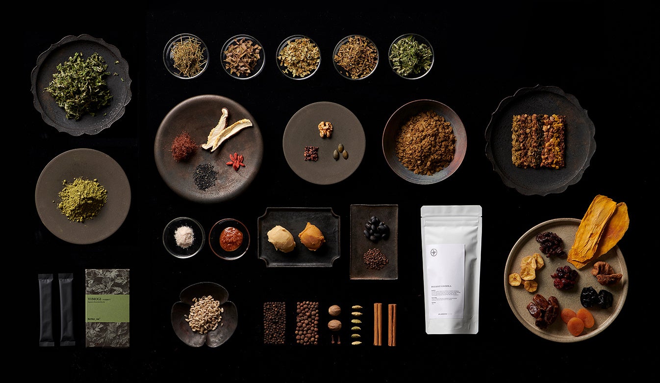 特徴的な素材のひとつが、阿蘇薬草園と共同で製産している「発酵よもぎ」。伝統的なよもぎに発酵技術を加え、まろやかで奥深い味わいに仕上げました。さらに、阿蘇薬草園で育まれた**山草(おおばこ、柿の葉、びわの葉、くまざさ、かき通し、山人参、どくだみ…)**や、希少性の高い沖縄の黒人参や皇金ウコン、白味噌・酒粕などを取り入れ、自然の恵みを活かした味わいをお届けします。